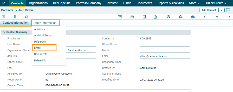 Navigate to the More Information tab and Click on Email.