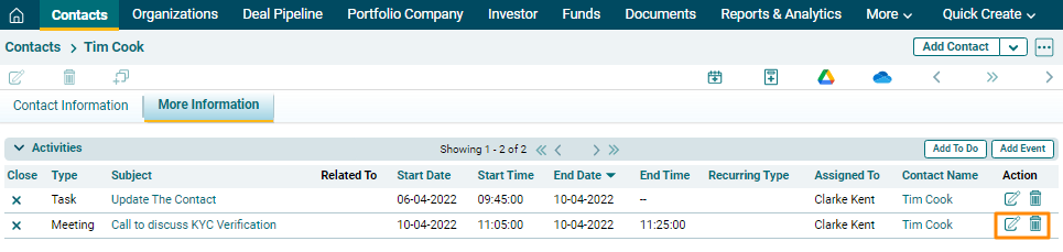 9. The Event will be listed in the Activities Panel under the More Information Tab. Click on the Edit or Delete icons to make changes.