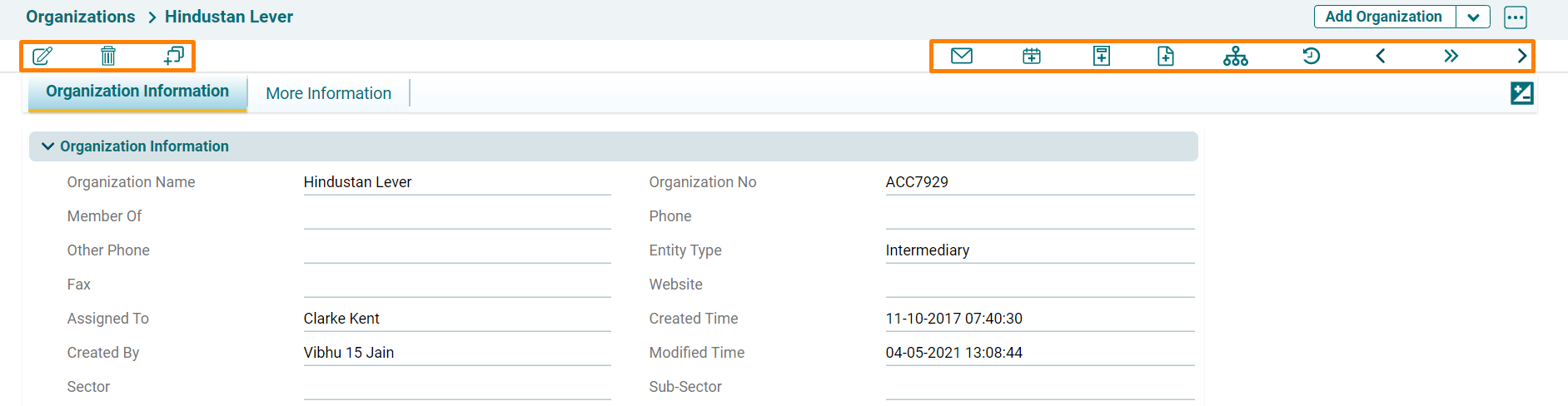 - 2. Click Delete icon to delete the existing Organization record.
