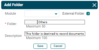 4. To create an external folder, i.e. a default folder which is not specific to any module, click the External Folder checkbox. An external folder is not visible in any module.