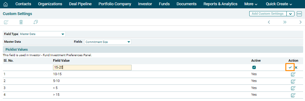 4. The field is activated. Enter the Field Value. Click the check box to make the picklist value active. Click the Check button to save.