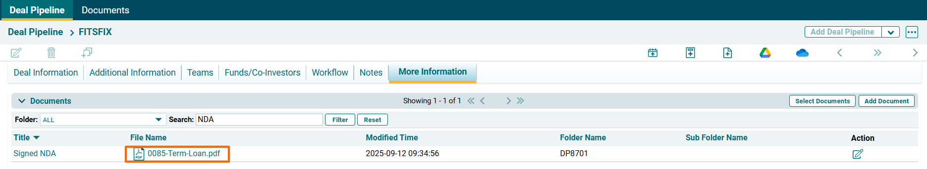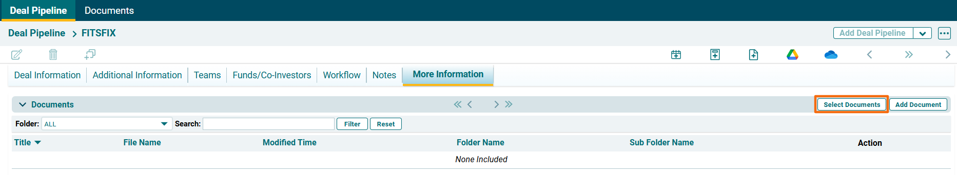 2. Click on the More Information tab. There are several panels here, including the Documents panel. Click on Select Document button in the top right corner of the panel.