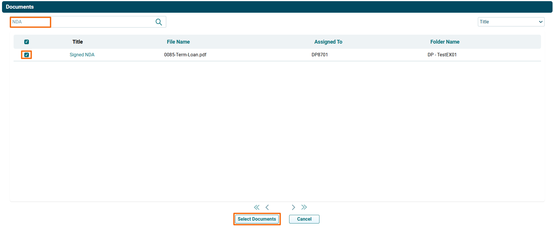 3. The Documents window is displayed. Type the file name in the search box. Check the checkbox against the file name. Click on Select Documents button.