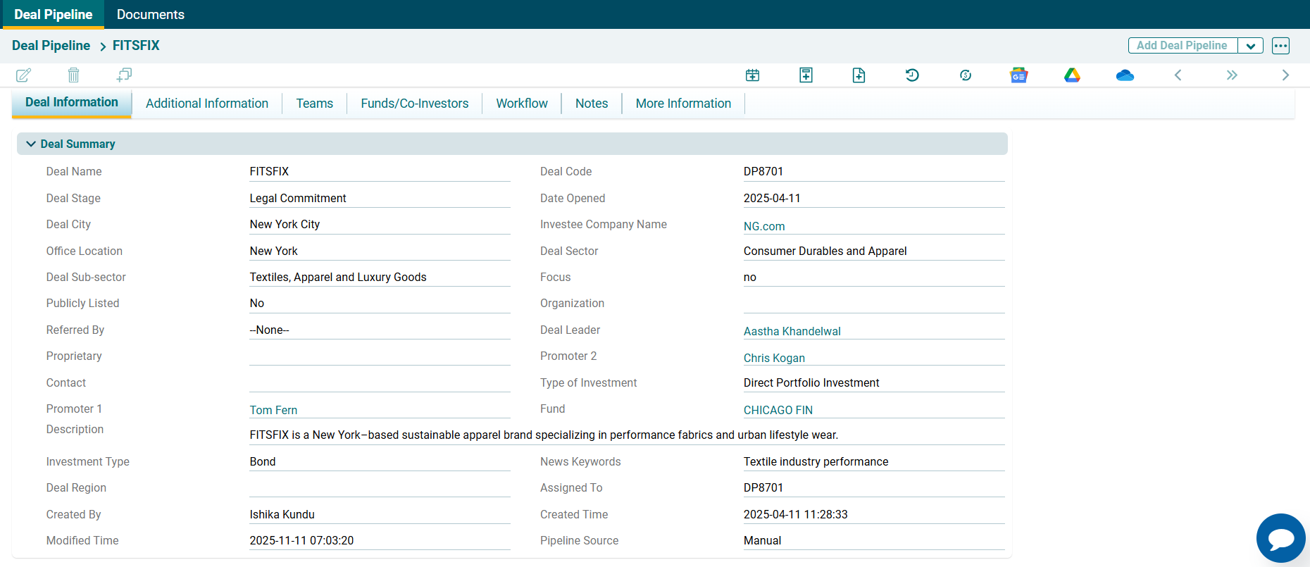 This tab contains the primary details pertaining to a deal at the time of creation. It has five panels which have been described below along with their fields.