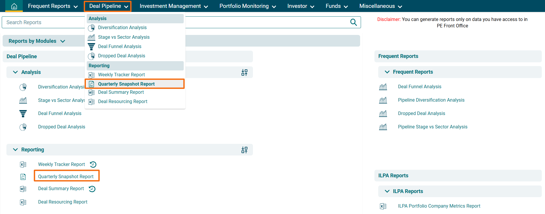 2. You can access the report from the dashboard by clicking Quarterly Snapshot Report in the Deal panel or from the Deal Pipeline drop-down menu in the blue vertical bar.
