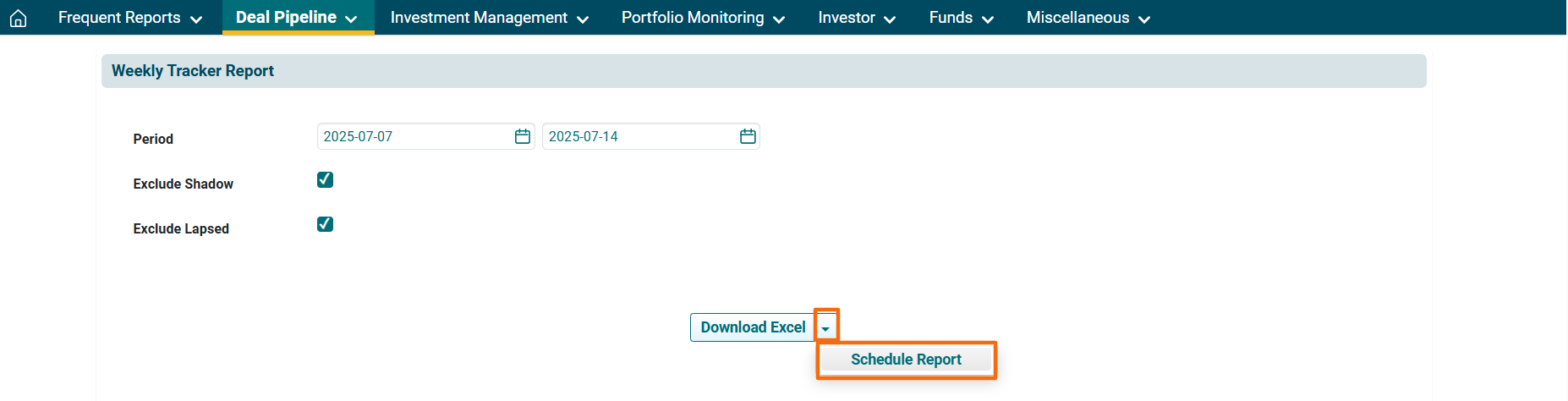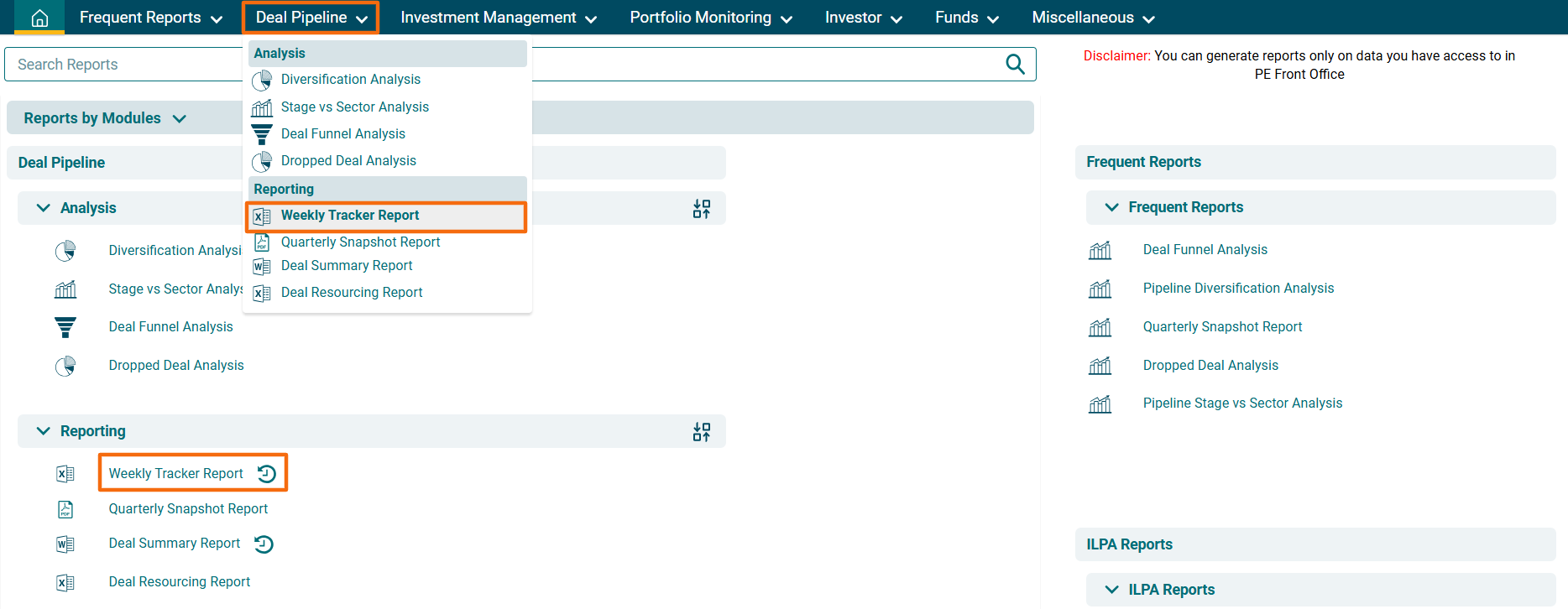 2. You can access the report from the dashboard by clicking Weekly Tracker Report in the Deal panel or from the Deal Pipeline drop-down menu in the blue vertical bar.