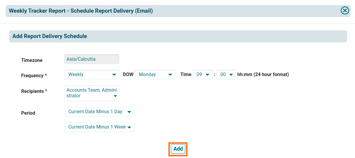 - Frequency: Choose the frequency of the report delivery, i.e., Daily, Weekly, Monthly or Annually. Choose Time.