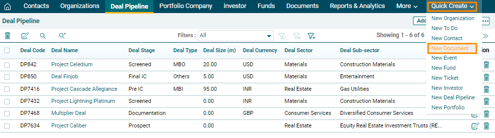 Upload required documents in the PE Front Office Document Depository. You can upload them directly from an Internal Drive, or provide an External URL from which they can be accessed. You can group the files in various folders and sub-folders.