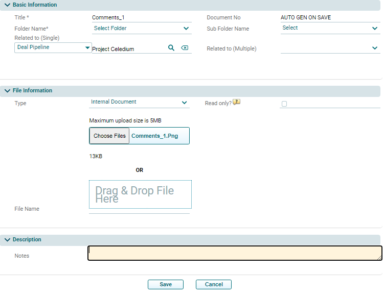 4. The Document Information window is displayed. Update the required details, attach the file and click on Save.