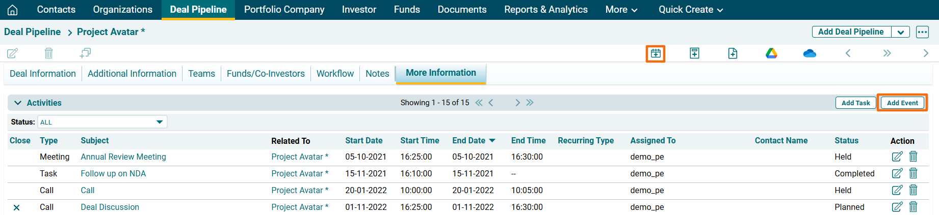 2. Click on the Add Event icon above the tabs or Add Event button on the top right corner of the Activities panel.