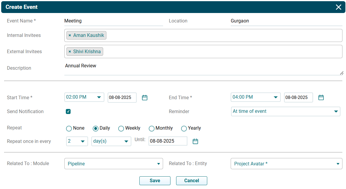 - Related To (Module): Event gets related to the module automatically.