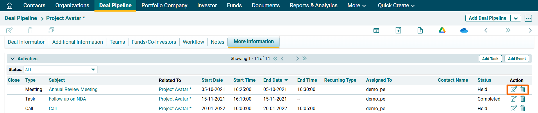 5. The Event will be listed in the Activities Panel under the More Information Tab. Click on the Edit or Delete icons to make changes.