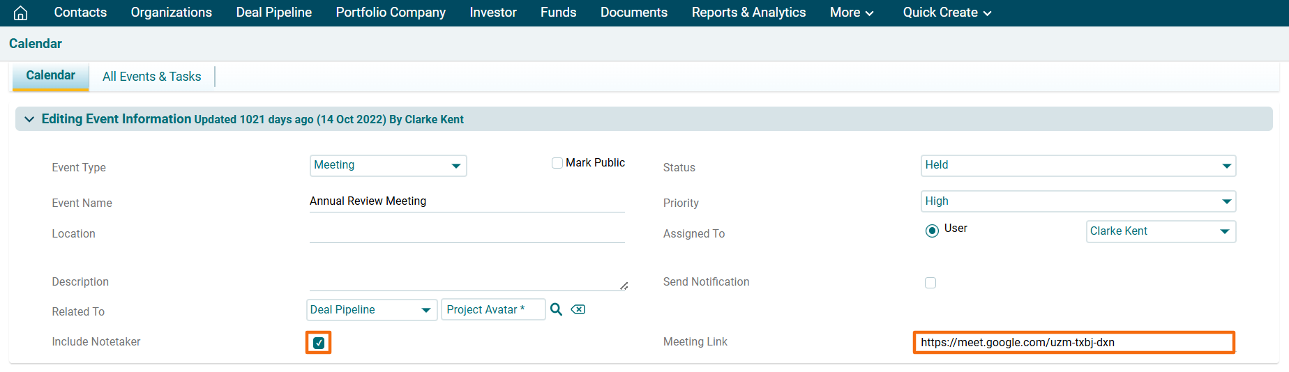 ) in the Actions column. Check the Include Notetaker checkbox. Post the Meeting Link. Click Save.
