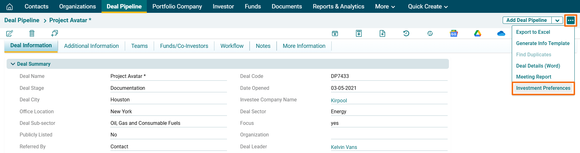- Group By: To group by Deal or Investor