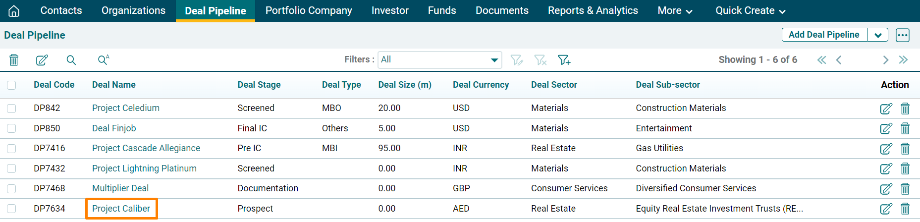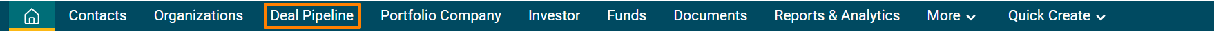 5. The created deal can be accessed from the Deal Pipeline Menu. The deal is visible on the Deal Pipeline List View page.