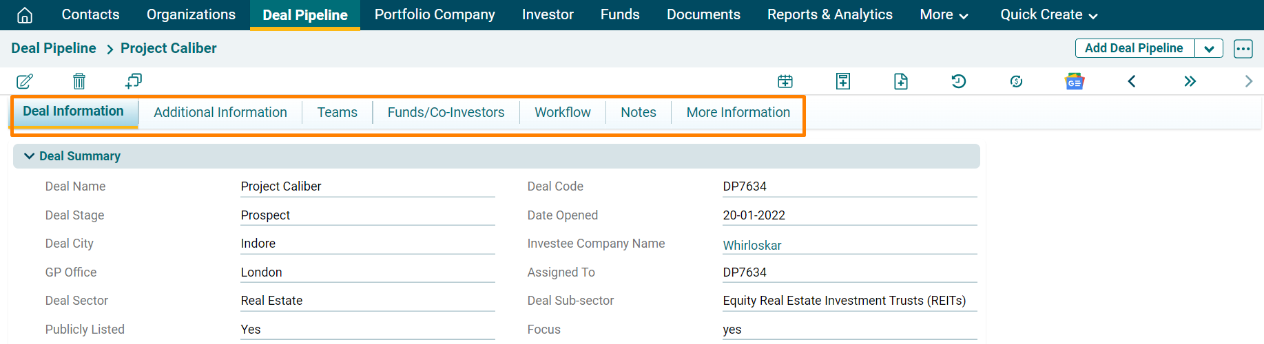 4. Once the Deal has been created, you will see different tabs here: Additional Information, Teams, Funds/Co-Investors, Workflow, Notes, and More Information. Fill in all the details by navigating to the respective tabs.
