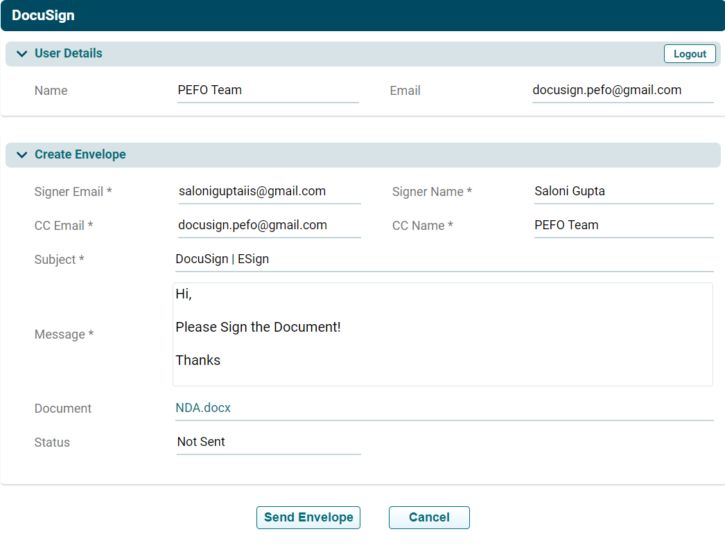 - User Details: The User details are auto-populated based on the DocuSign login.