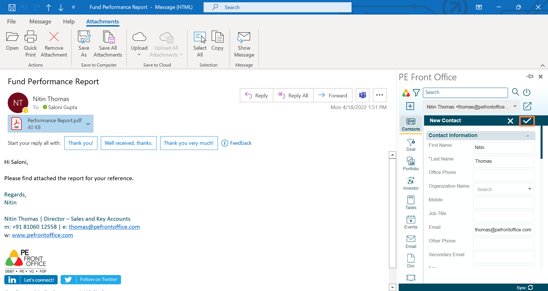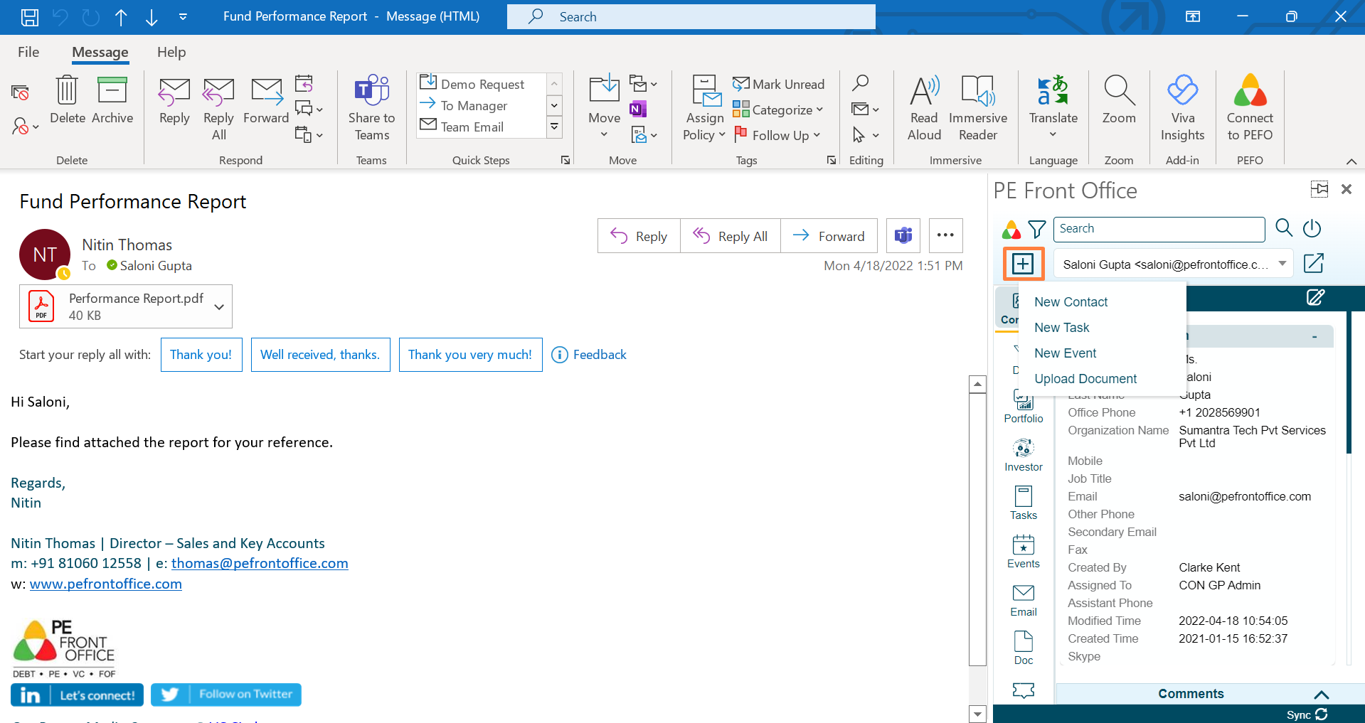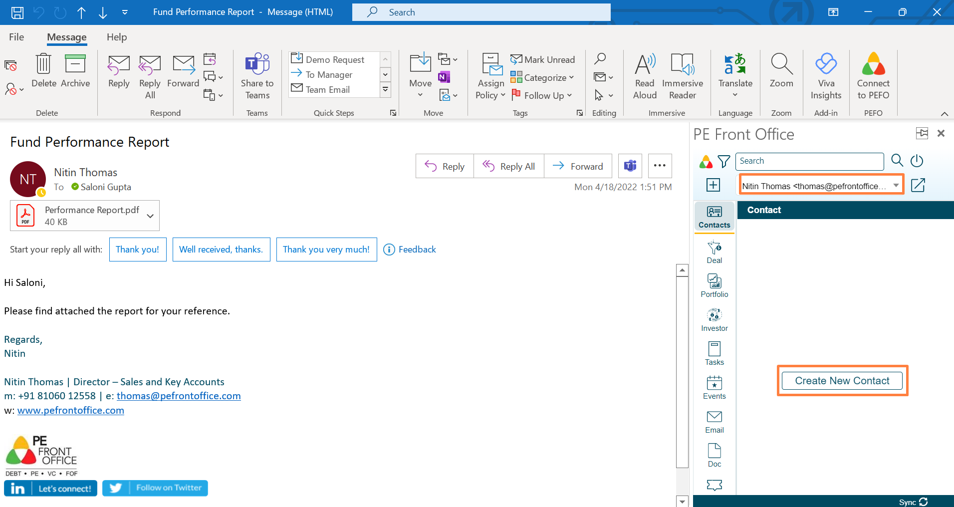 side of your outlook window. It allows the user to create new contact right from Outlook PlugIn and view it in PE Front Office system.