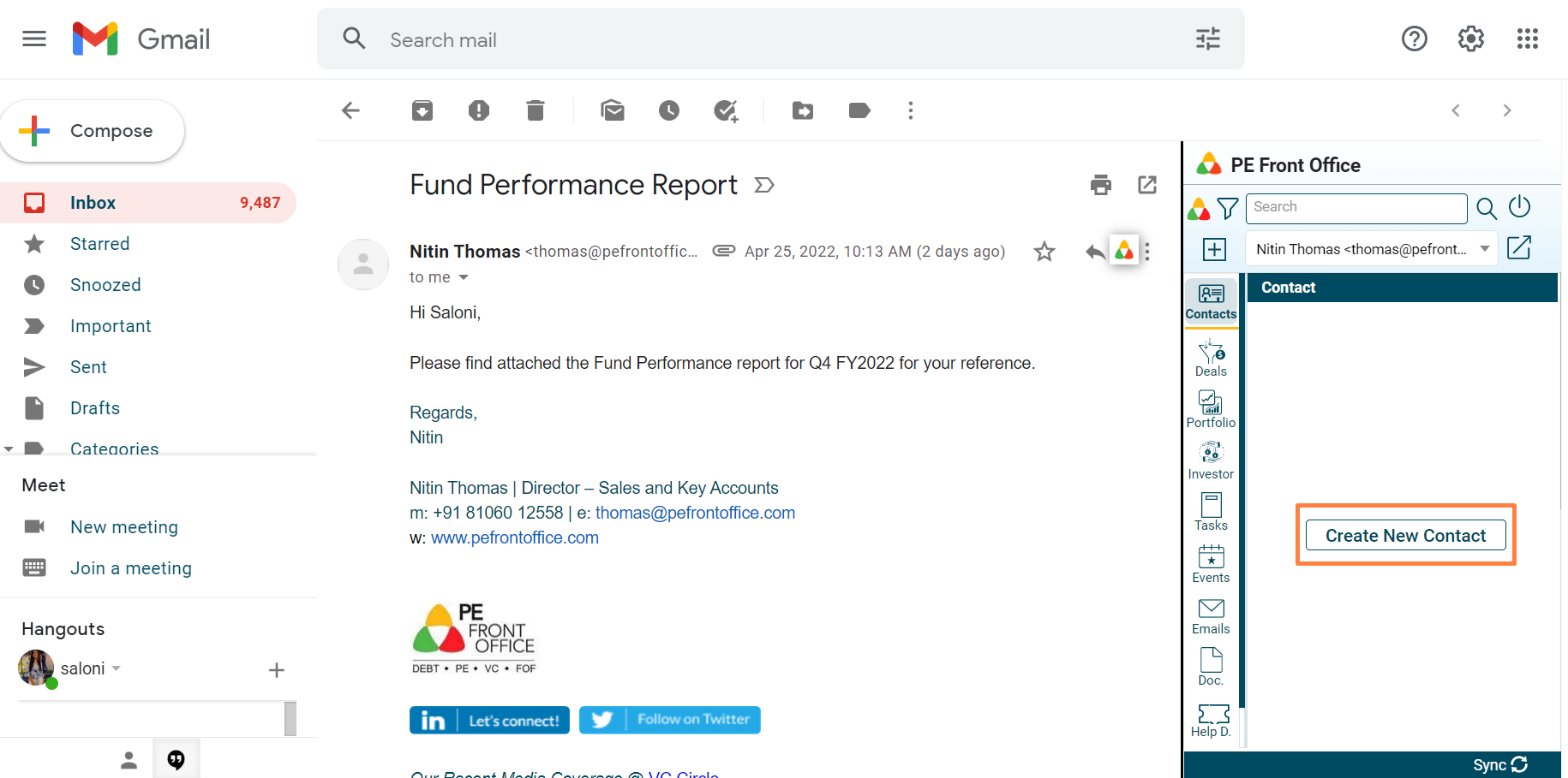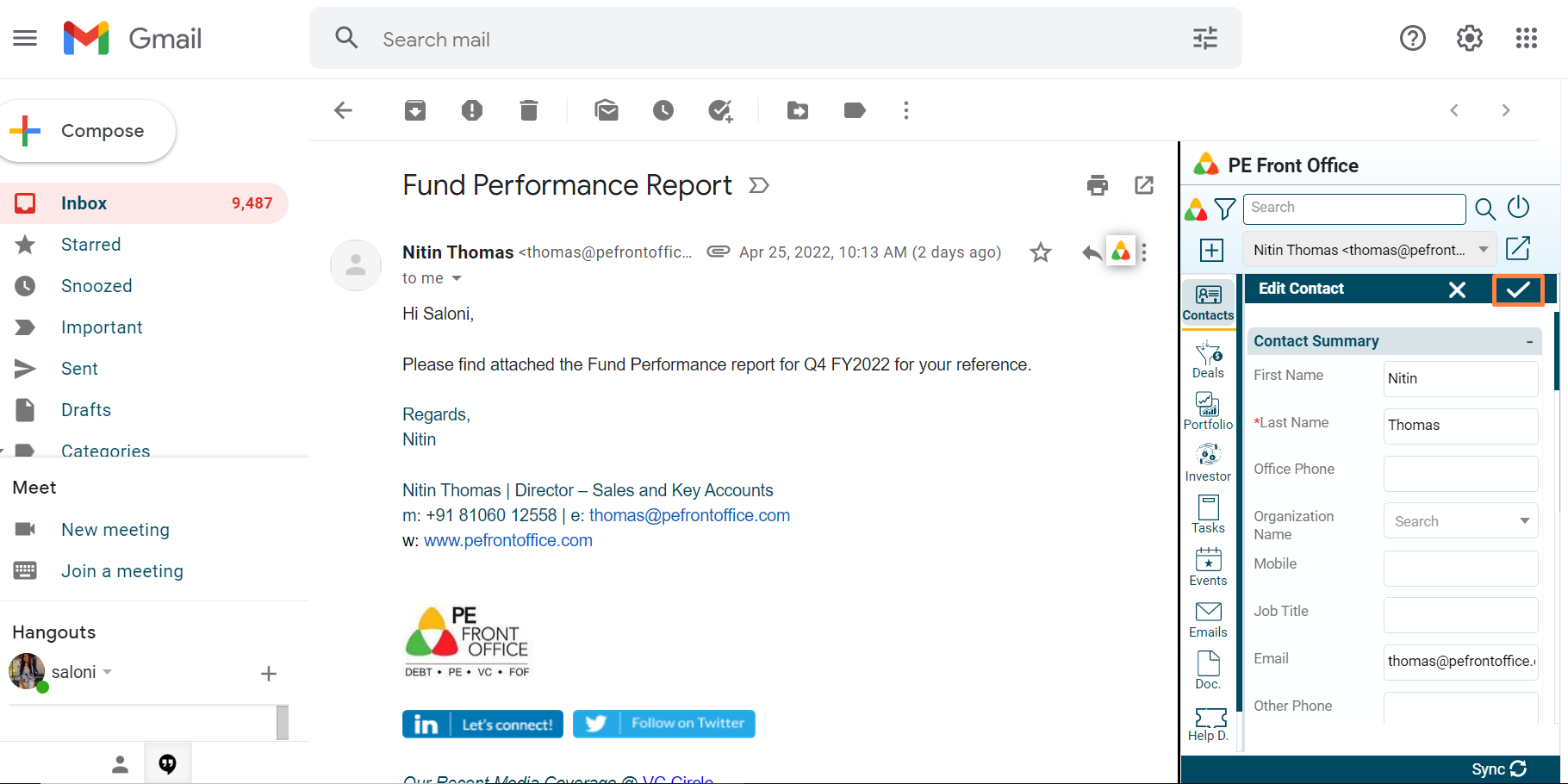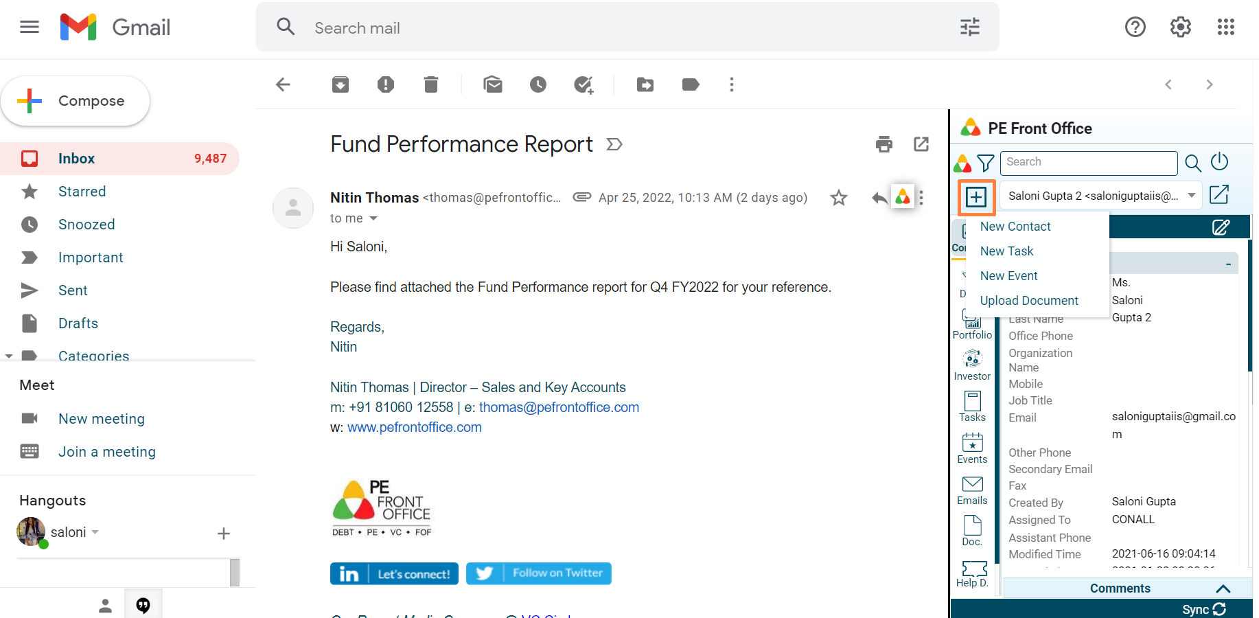 The PE Front Office plugin will appear on the right-hand side of your outlook window. It allows the user to create a new contact right from Gmail PlugIn and view it in PE Front Office system.