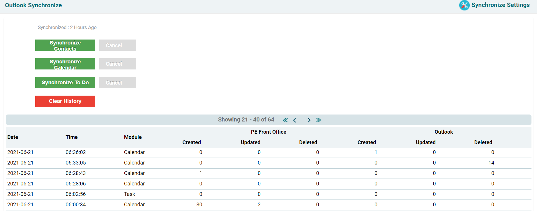 review the sync history along with date, Time, and module.