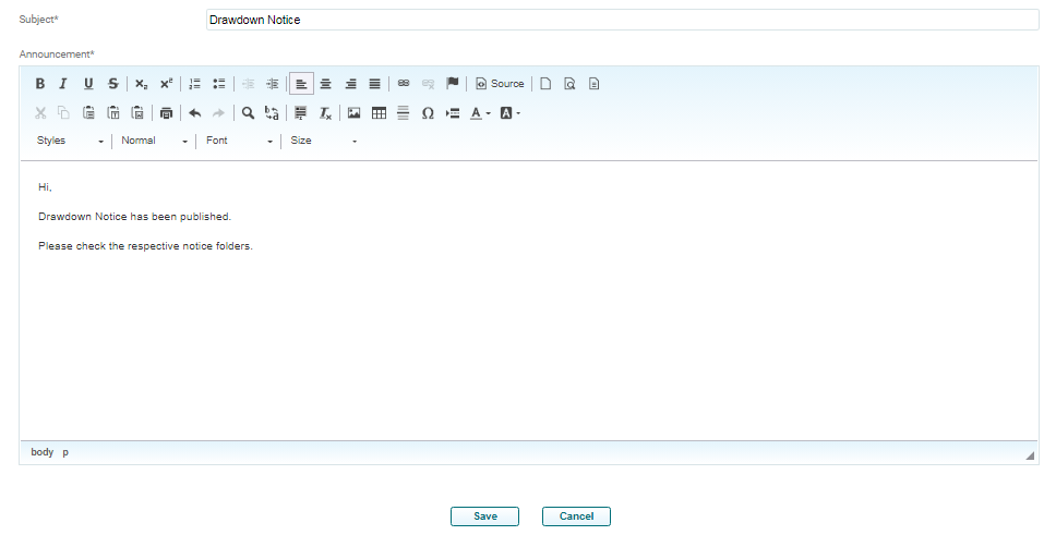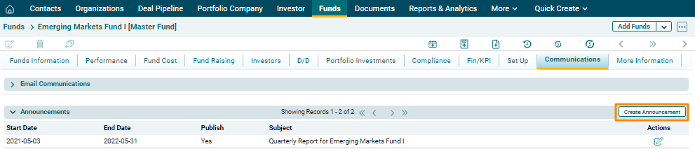 Announcements panel allows you to create an announcement that the user wants to publish for various investors on the investor portal.