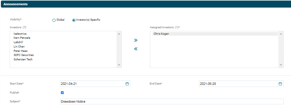 - Visibility: Choose an option, i.e. Global or Investor(s) Specific. Announcements will be visible only to the investor you select from the field below, if you choose Investor(s) specific. By choosing Global, announcement shall be visible to all investors related to the fund.