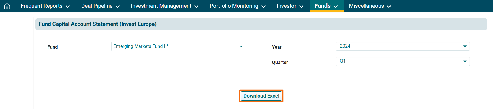 3. The Capital Account Statement (Invest Europe) window is displayed. Choose a fund, year and quarter for which you wish to see the Capital Account Statement. Click on Download Excel. The excel file will download.