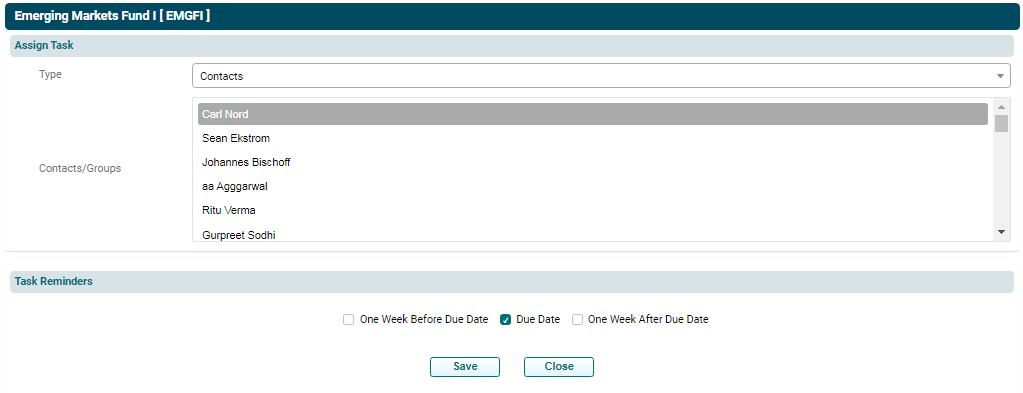 Select the Type, i.e. Contact or Groups. Select the Group or Contact. Check one of the task reminder box, i.e. One Week Before Due Date, Due Date, One Week After Due Date. Click on Save.