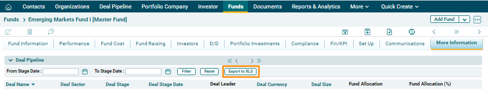 To export the Deal Pipeline data into excel, click on Export to XLS button in the horizontal bar of the panel. The Excel file will download.