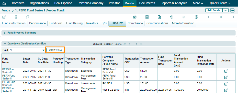 To export the drawdown distribution cashflow data into excel. Click on Export to XLS button in the horizontal bar of the panel. The excel file will download.