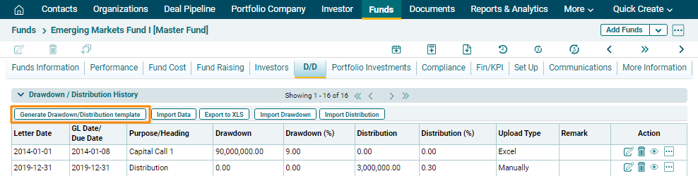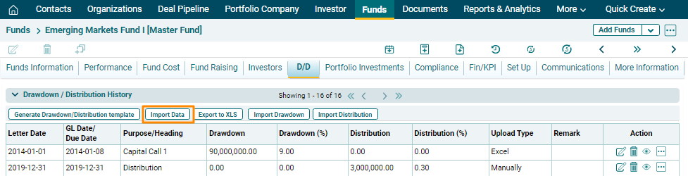 details, Import Drawdown and distribution in bulk, and also export D/D