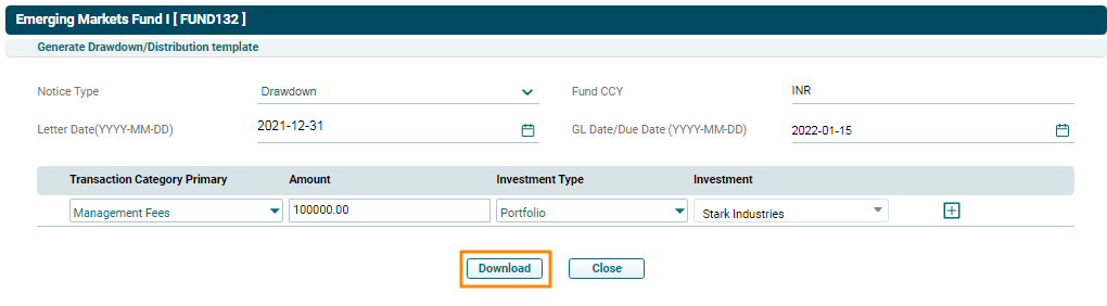 1. Click on Generate Drawdown/ Distribution Template button in the horizontal bar of