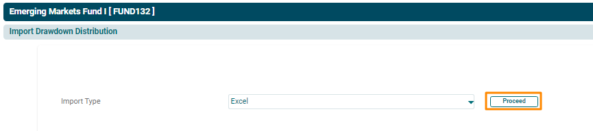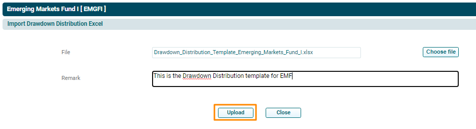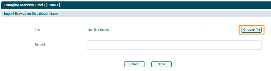 4. The Import Drawdown/ Distribution Excel window is displayed. Click on Choose File.