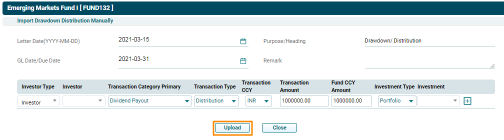 - Transaction Type: Choose transaction type, i.e., Drawdown or Distribution.