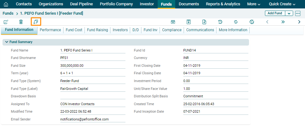 2. The Fund Information window is displayed. Click on the Duplicate icon in the top left corner.