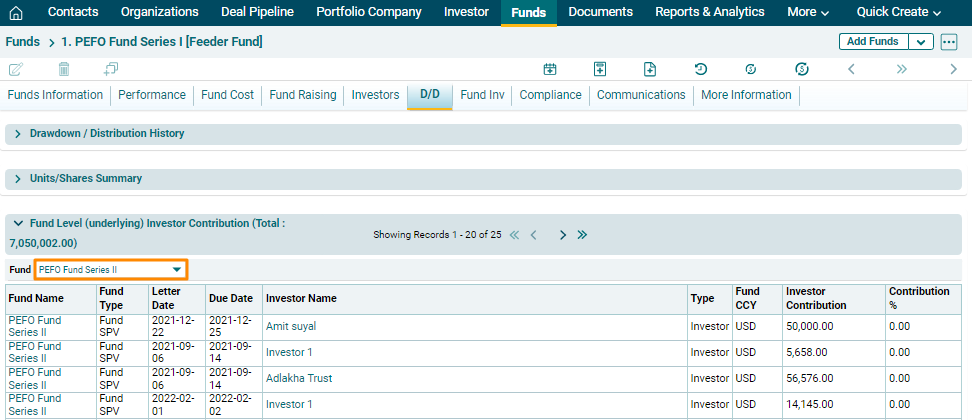 Fund Level- Investor Contribution panel allows you to view the investment made by the fund in other funds. This is applicable to Fund of Funds, Fund SPV and Feeder Fund.