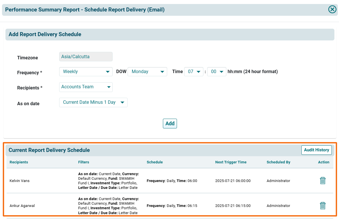 - Frequency: Choose the frequency of the report delivery, i.e., Daily, Weekly, Monthly or Annually. Choose Time.