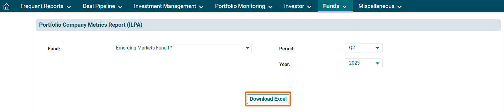 2. You can access the report from the dashboard by clicking Portfolio Company Metrics Report ILPA in the Funds panel or from the Funds drop-down menu in the blue vertical bar.