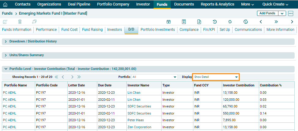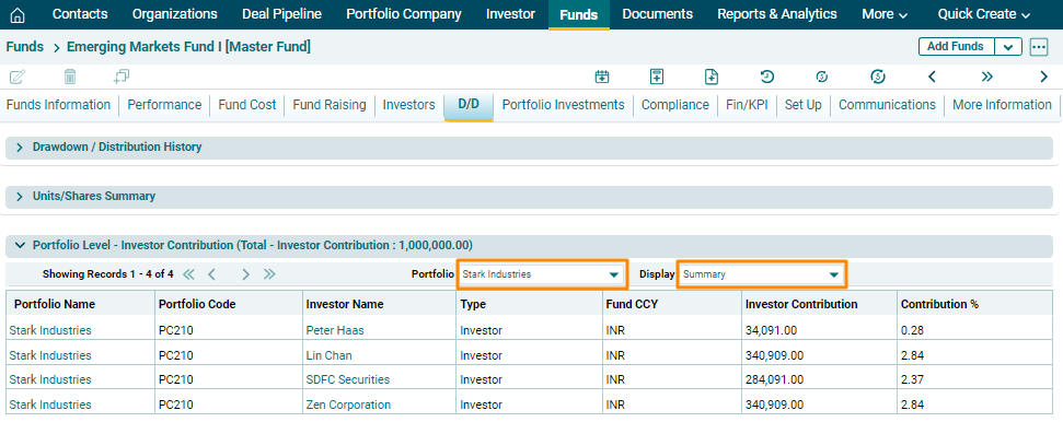 Portfolio Level- Investor Contribution panel allows you to view the investment made by the fund in the portfolio companies. This panel is applicable to Master Fund, Direct Fund, Fund SPV and Fund of Funds.