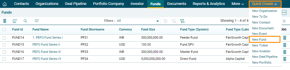 1. In Quick Create menu on the top bar, click on the New Fund.
