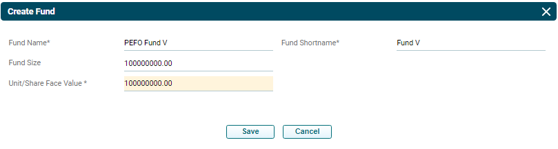 2. The Create Fund pop-up will be displayed. Update the mandatory details marked with an asterisk and click Save.