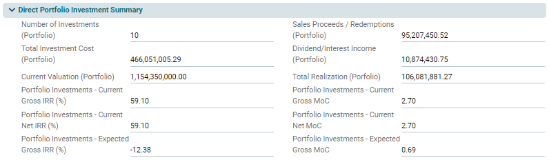 This panel is applicable to Direct Fund, Master Fund, Fund SPV, and Fund of Funds. This panel allows you to view details of direct portfolio investment and return on those investments. This is an auto-populated panel flowing from Portfolio Investments tab.