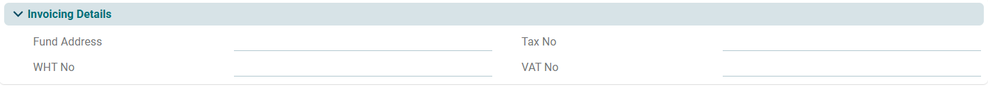 This panel allows you to enter the fund’s invoicing details, including the fund address, WHT rate, tax number, and VAT number.