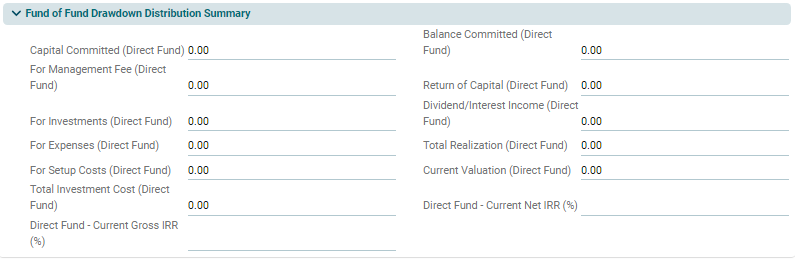 This panel is applicable to Direct Fund. This panel allows you to view the details of total drawdown and distribution with investors. This is an auto-populated panel flowing from D/D tab.