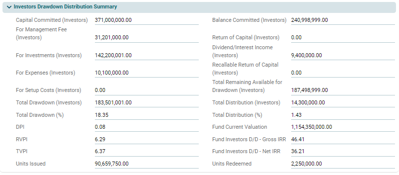 This panel is applicable to Master Fund, Feeder Fund, Fund SPV, and Fund of Funds. This panel allows you to view the details of total drawdown and distribution with investors. This is an auto-populated panel flowing from D/D tab.