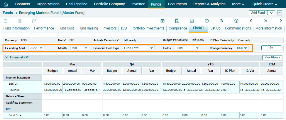 Users can view either All Fields or only Fund level fields by selecting from the Financial Field Type dropdown and the numbers in different currencies, you can select the desired currency from the dropdown list Change Currency dropdown.
