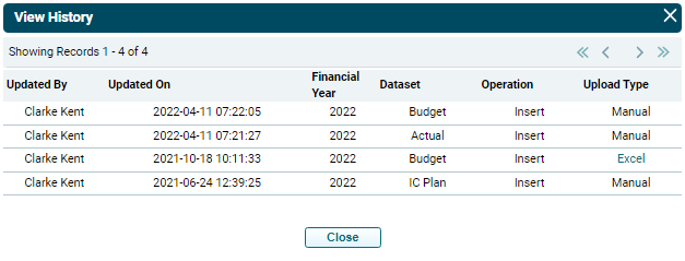 ) button in the top right corner. This will give you an audit trail of all the updates in financials along with the details like Name of the user who has done the operation, Date and Time, Year, Dataset, Type of operation, Upload type, Status, Notes and Up till which month the data has been updated. You can also download excel of the previously uploaded versions of Financials/KPI.