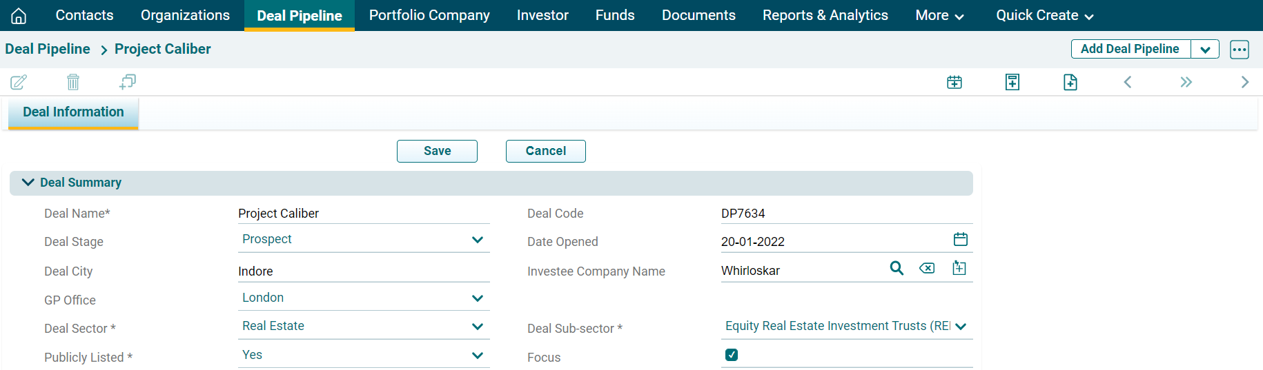 4. Once the Deal has been created, you will see different tabs here: Additional Information, Teams, Funds/Co-Investors, Workflow, Notes, and More Information. Fill in all the details by navigating to the respective tabs.