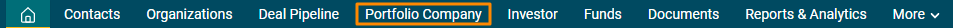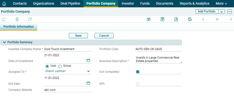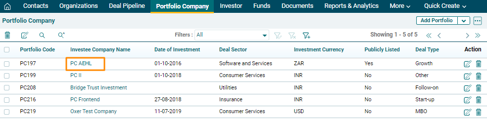 5. The created portfolio company can be accessed from the Portfolio Company menu. The company is visible on the Portfolio Company List View page.