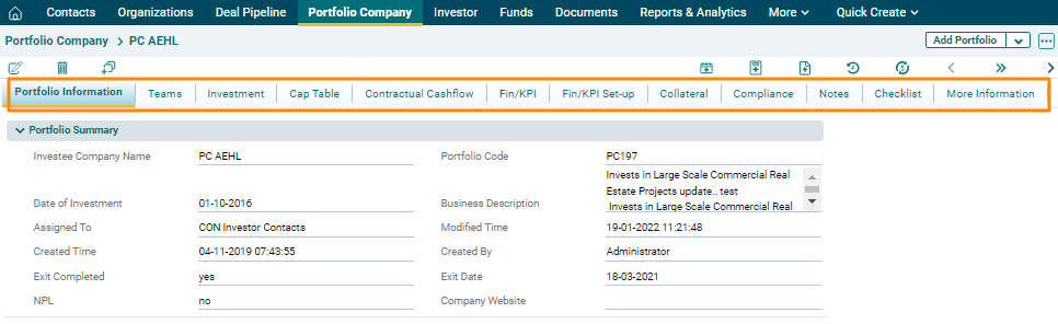 4. Once the Portfolio has been created, you will see different tabs here- Teams, Investment, Cap Table, Contractual Cashflow, Fin/KPI, Fin/KPI Setup, Collateral, Compliance, Notes, Checklist, and More Information. Fill in all the details by navigating to the respective tabs.